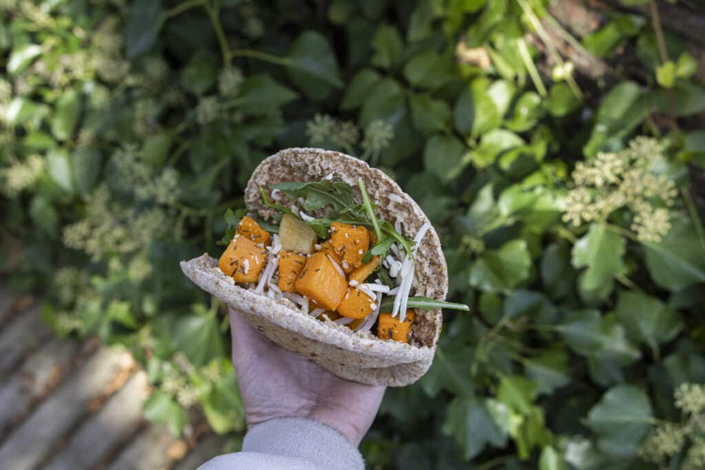 Op een zachte volkoren pita leggen we: geroosterde pompoen, frisse rucola, romige geitenkaas, salieboter en een vleugje tijm. De rucola heeft het keurmerk “Eerlijk en Gezond” dus dat zit ook nog eens goed.
